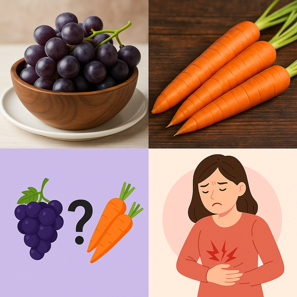 포도와 당근은 둘 다 껍질째 먹는 경우가 많기 때문에, 세척이 불충분할 경우 미생물 오염이 있을 수 있어요. 이럴 경우 설사, 복통 등 식중독 증상이 나타날 수 있으며, 이는 음식 조합 때문이 아니라 위생 관리의 문제입니다.