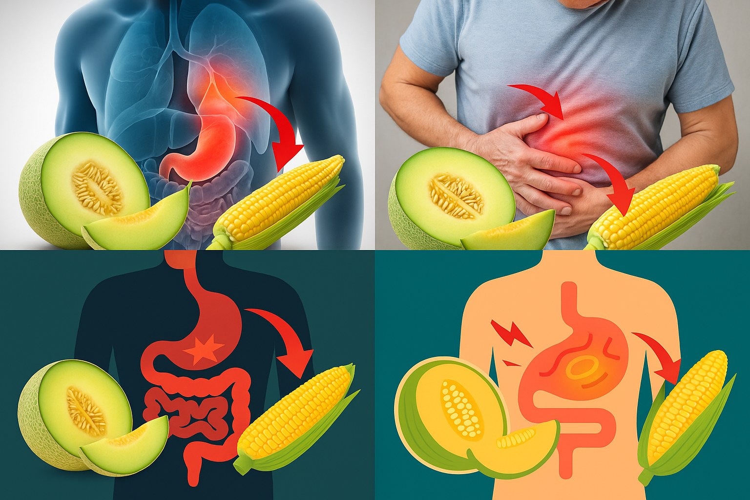 소화가 빠른 멜론이 먼저 위를 지나가야 하는데, 소화가 느린 옥수수가 위에 머무르면서 멜론이 정체됩니다. 이로 인해 발효작용이 촉진되어 장내 가스를 생성하며, 복부 팽만감과 트림, 가스참 등의 증상을 유발할 수 있습니다.
