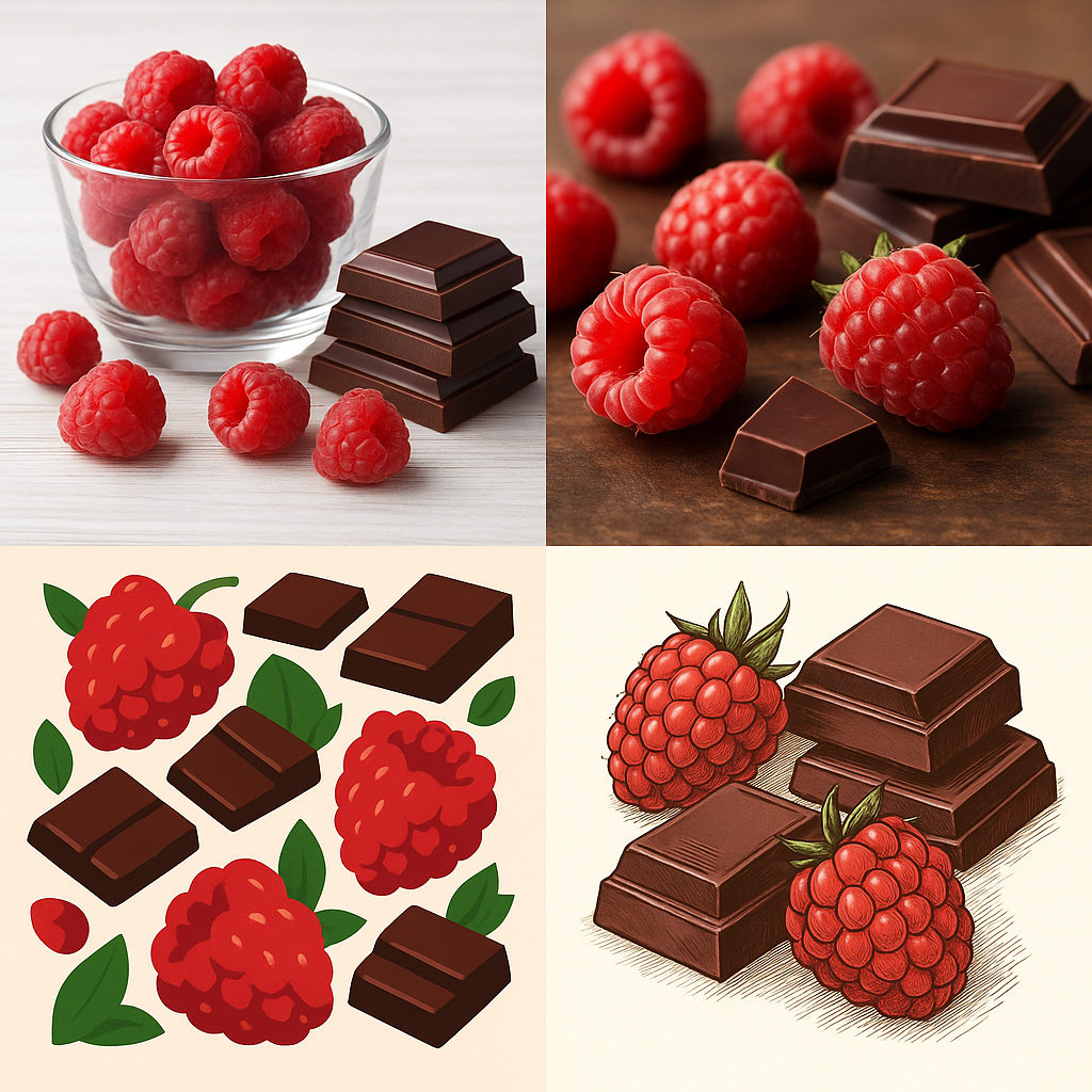 라즈베리는 비타민 C, 안토시아닌이 풍부해 항산화 및 면역 강화에 좋고, 초콜릿은 플라보노이드, 마그네슘 등을 포함해 심혈관 건강 및 기분 개선에 도움을 줄 수 있습니다.